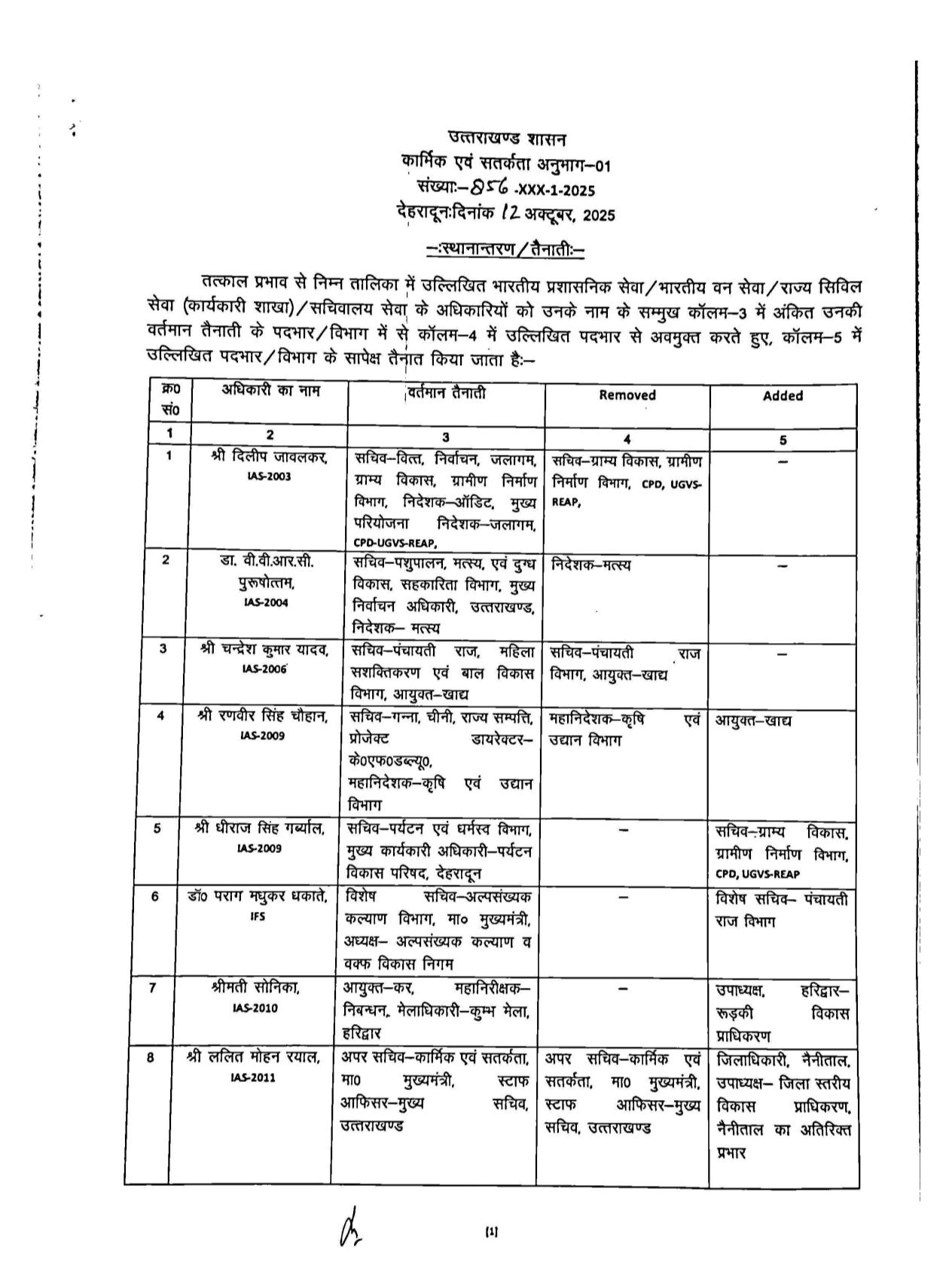 8. ललित मोहन रयाल (IAS) को नैनीताल के जिलाधिकारी और जिला स्तरीय विकास प्राधिकरण के उपाध्यक्ष के अतिरिक्त प्रभार से हटाकर अब उन्हें अपर सचिव (कार्मिक एवं सतर्कता) और मुख्य सचिव के स्टाफ ऑफिसर के रूप में देहरादून में तैनात किया गया है।